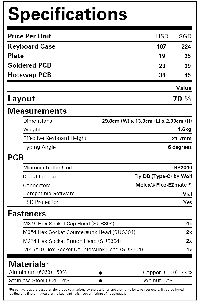 "From the outset, I had a very singular vision for what I wanted to achieve with Univers' sound and type feel. It needed to have a satisfying bottom out while achieving a clean and balanced sound signature. I did not want it to be muted by foam, nor did I want it to sound too hollow. I also have a particular distaste for keyboards that started the arms race to achieve peak 'flex'. It got to the point where plates and PCBs started to look like they got pushed through a cheesegrater. These often came at the expense of actual user experience, sacrificing sound and feel for those few glamorous seconds you see it happen on a youtube video. Fortunately, the pendulum seems to be swinging back in favor of a more balanced approach in recent years. Back to Univers. We iterated on case acoustics, played around with different tadpole hardnesses, and experimented with different plate materials. The choices made are very much a reflection of my personal preference. It's unapologetically what I like, and I hope it'll be enjoyable for you too." - Jim